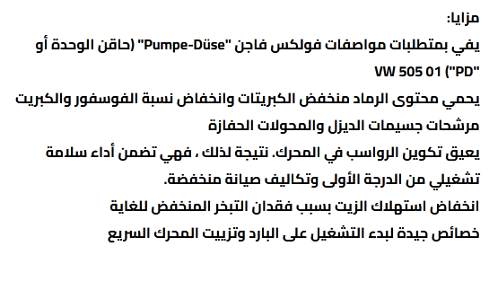 It meets the requirements of the VW ‘Pumpe-Düse’ (unit injector or ‘PD’) VW 505 01 specification