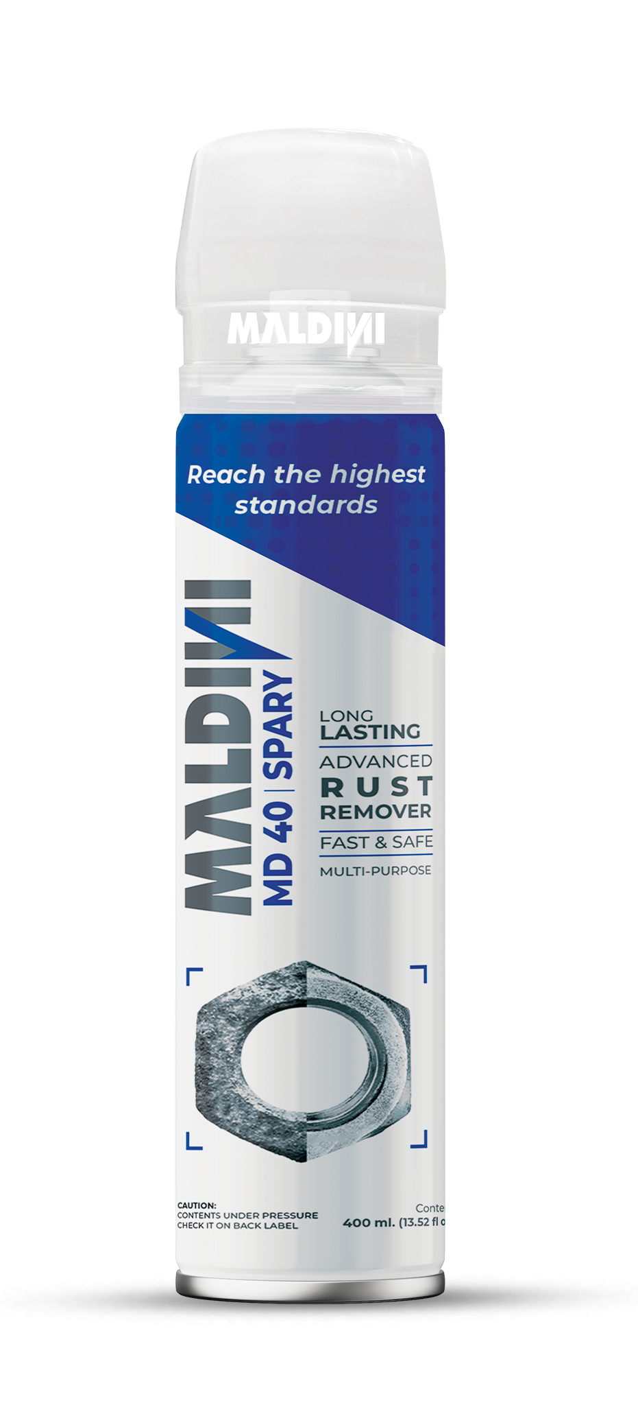 إم-دي 40 اسبراي مزيل الصدأ من مالديني ينظف ويحمي: يزيل علامات التلوين و الشحوم والقطران والصمغ والمواد اللاصقة. يزيل رواسب الماء العسر. يترك طبقة واقية ضد الصدأ والتآكل على الدراجات وعربات الأطفال والكروم والموتوسيكل والمحركات الخارجية والأدوات. يعمل علي وقف صوت الاحتكاك: يخترق المفصلات والعجلات والصنابير والمقابض والنوافذ و الدواسات وكراسي المكاتب ويشحمها. الإلتصاق يمنع التعليق ويزيت أقفال الأبواب والسحابات وآلات الخياطة ومفاتيح الآلة الكاتبة وأدوات التحكم والوصلات والكابلات.